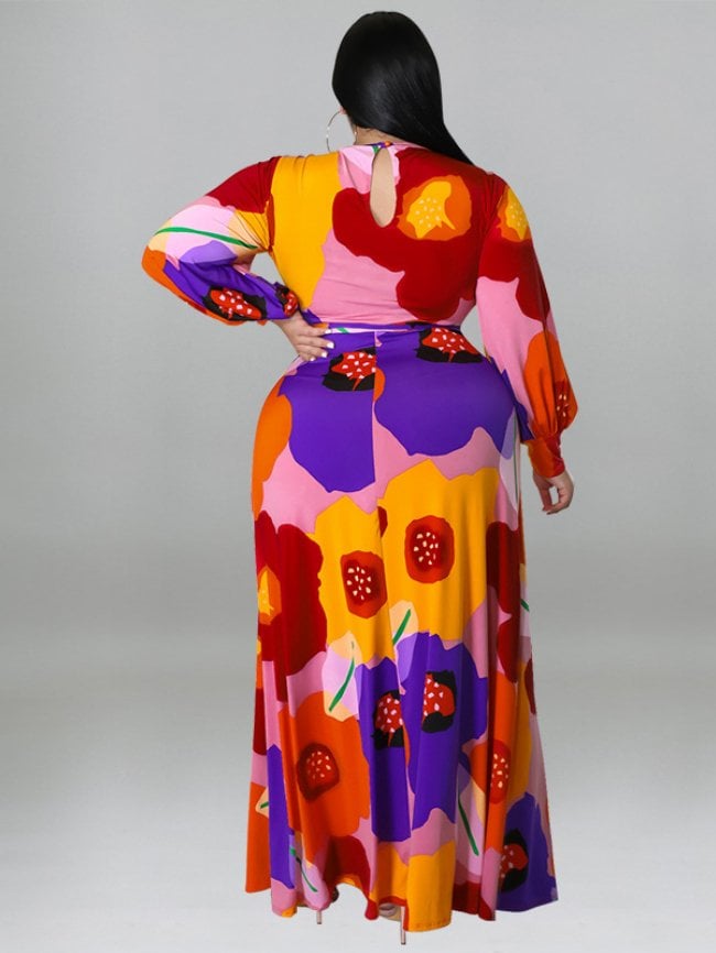 Style: ElegantPattern: FloralMaterial: 95%Polyester+5%SpandexSeason: Spring AutumnFit Type: Regular FitElasticity: Micro ElasticityColorful flower print to stand out from the crowdRound neck, long sleeves, attached with belt designSuitable for spring and autumn seasons and various occasionsWholesale plus size dresses, various fashion styles to choo...